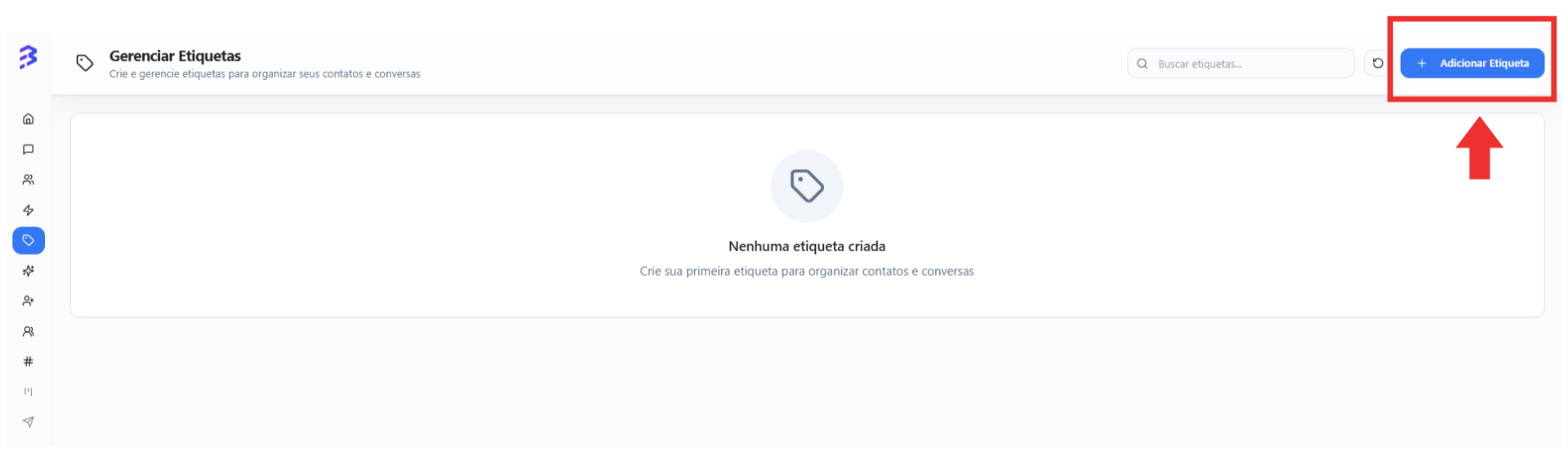 No menu lateral da plataforma, clique em Etiquetas. Você verá a lista de etiquetas já criadas ou uma tela vazia, caso ainda não tenha nenhuma.
