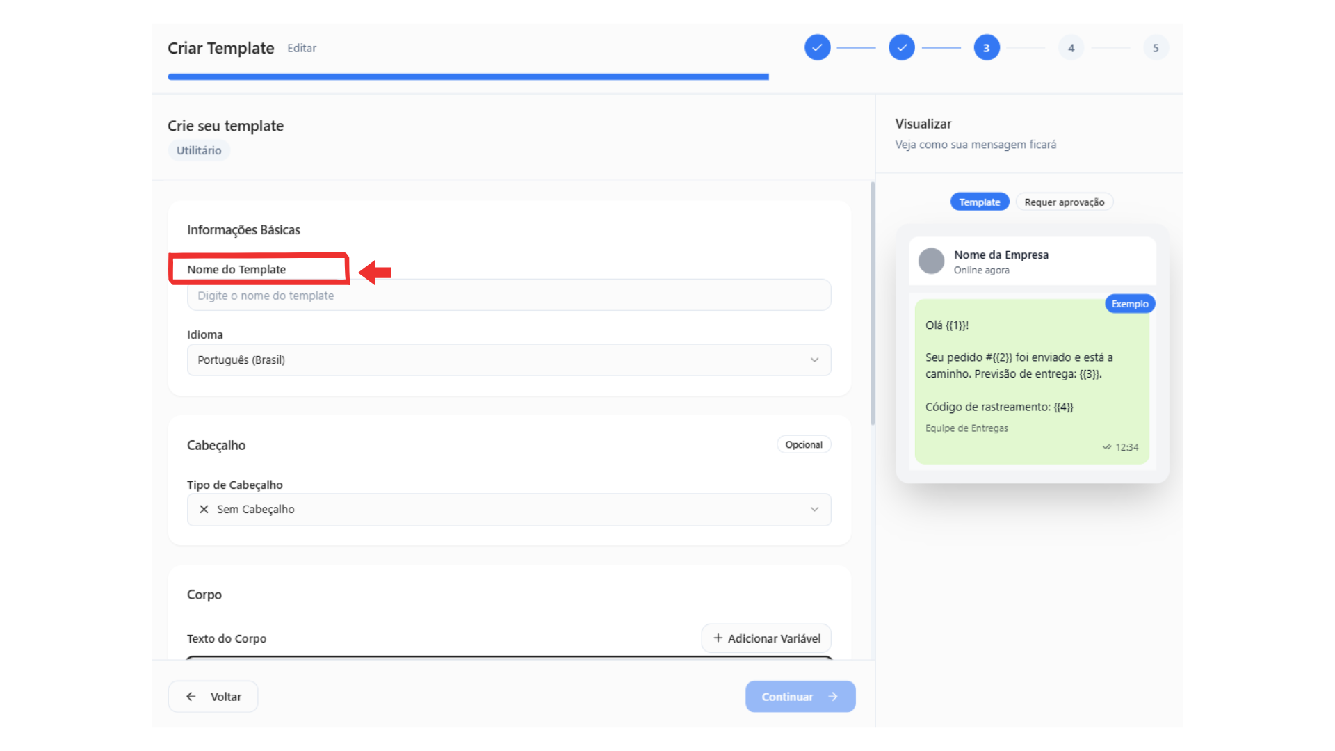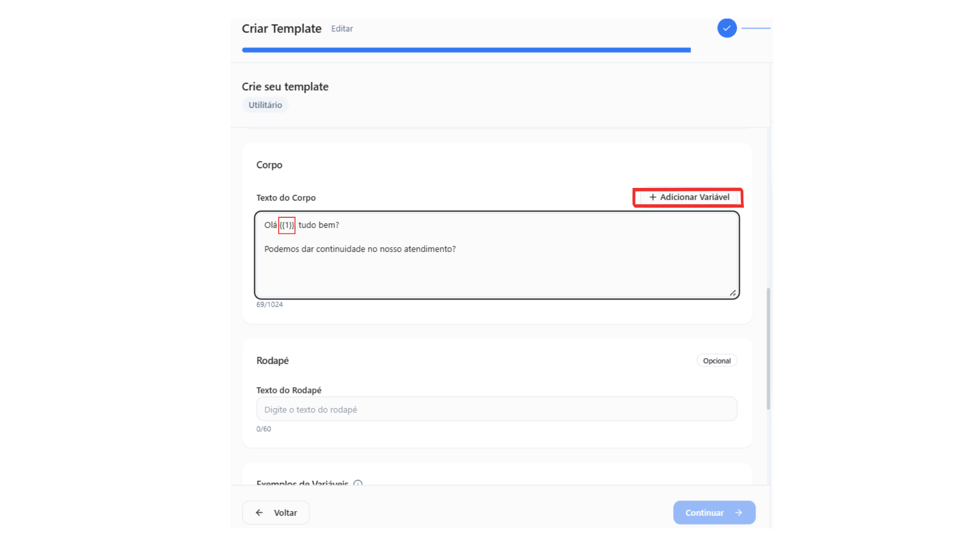 • Utilize variáveis bem distribuídas ({{1}}, {{2}}, etc.) para adaptar a mensagem sem precisar criar novos templates.