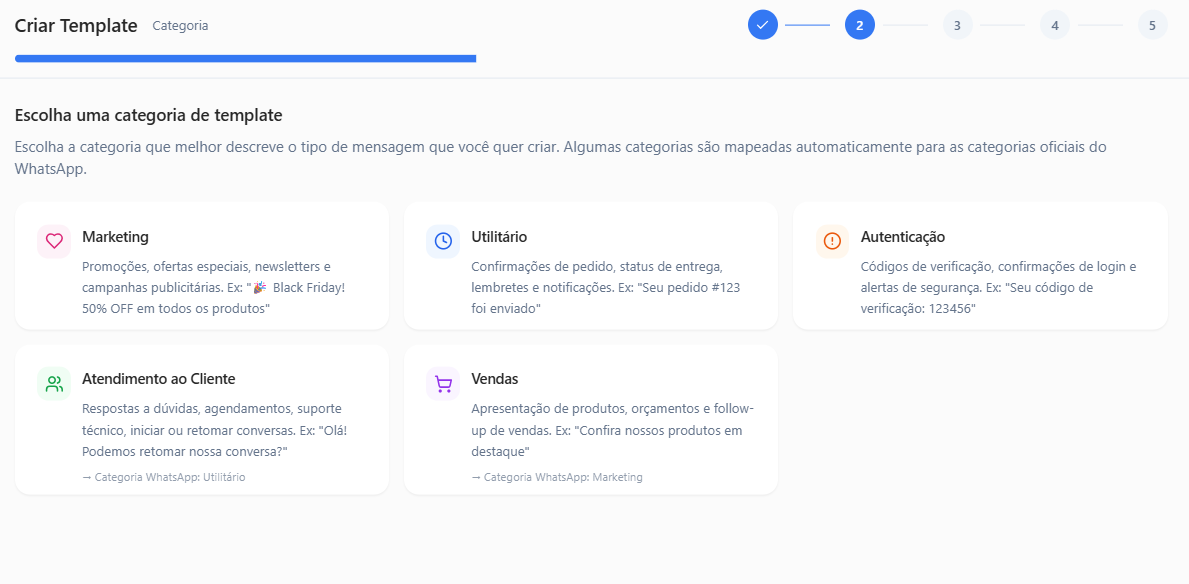 Escolha a categoria que melhor descreve o propósito da sua mensagem. Cada categoria possui uma breve descrição para ajudá-lo a identificar onde sua mensagem se encaixa. As mais comuns são "Atendimento ao Cliente" e "Vendas".