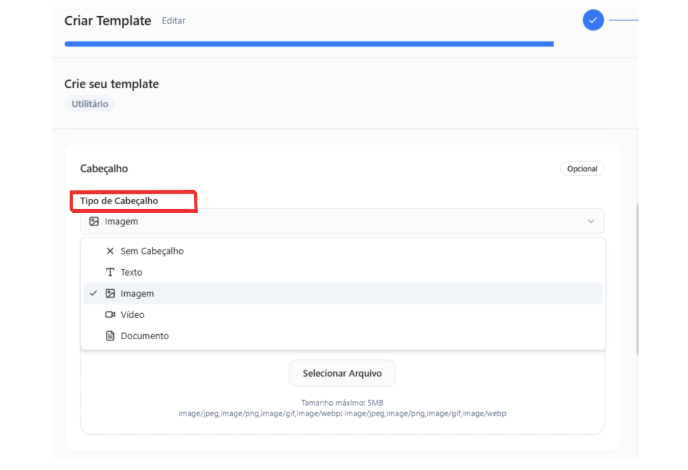 É possível adicionar um cabeçalho à mensagem. O cabeçalho será exibido acima do conteúdo principal e pode ser um texto curto, imagem, vídeo ou arquivo. Para configurar, selecione o arquivo desejado.
