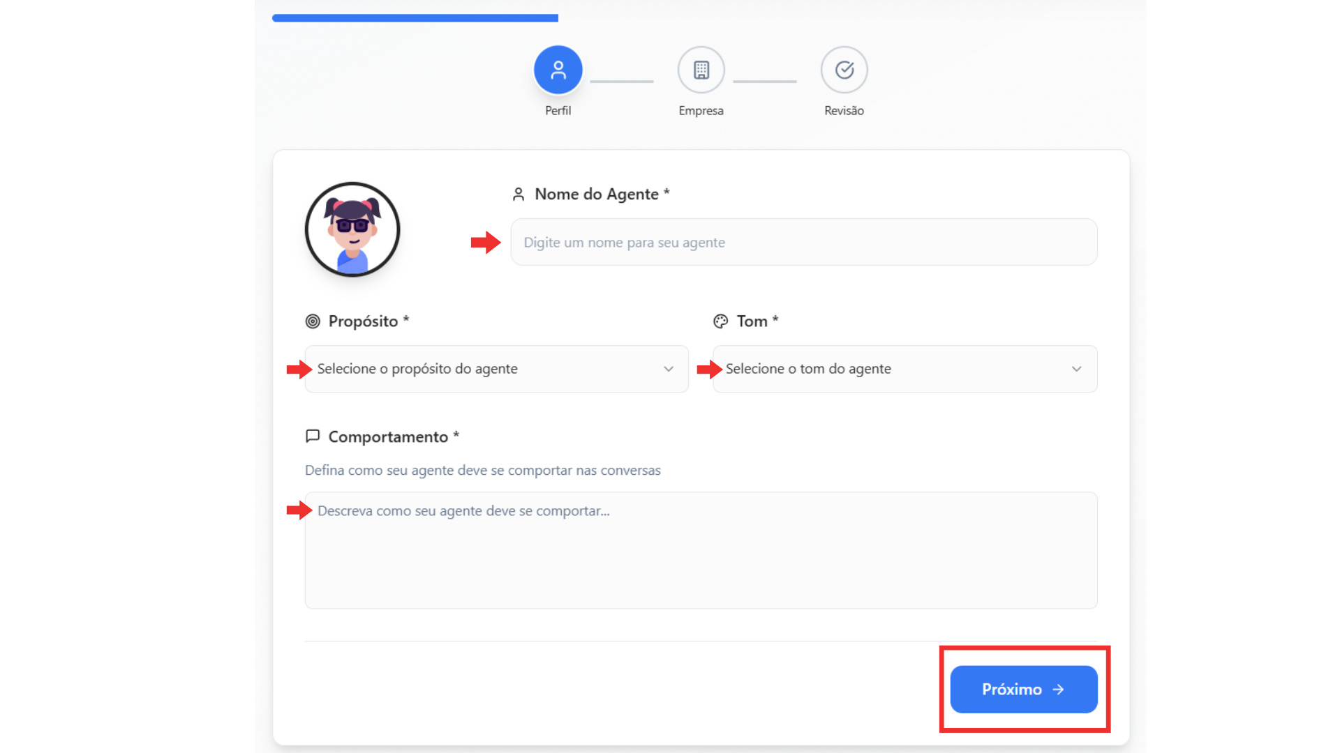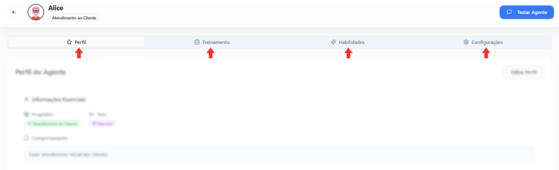 • Comportamento → Informe como o agente deve agir (não é treinamento, apenas uma instrução rápida).