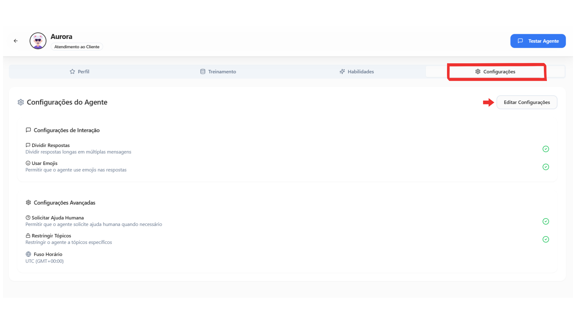Esse passo assegura que o agente esteja pronto para atuar no atendimento da sua empresa. Caso algo não funcione como esperado, você pode ajustar facilmente os treinamentos ou habilidades para alinhar o desempenho da IA às suas necessidades.