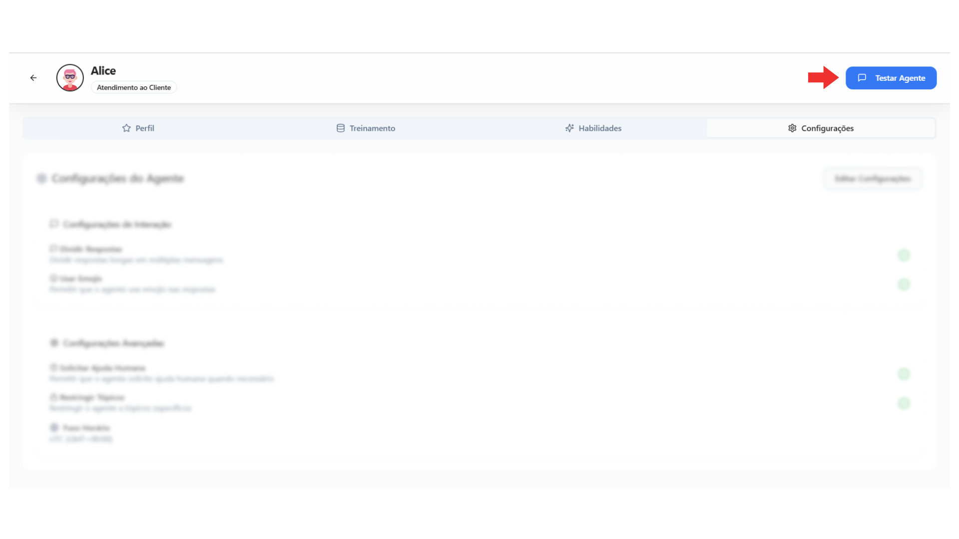 1. Clique em “Testar Agente”, no canto superior direito da tela.