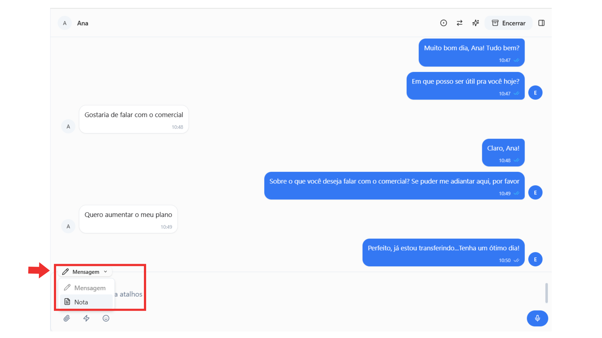 - Transferência de atendimento: ao repassar a conversa para outro agente, insira uma nota explicando o histórico e os pontos importantes.