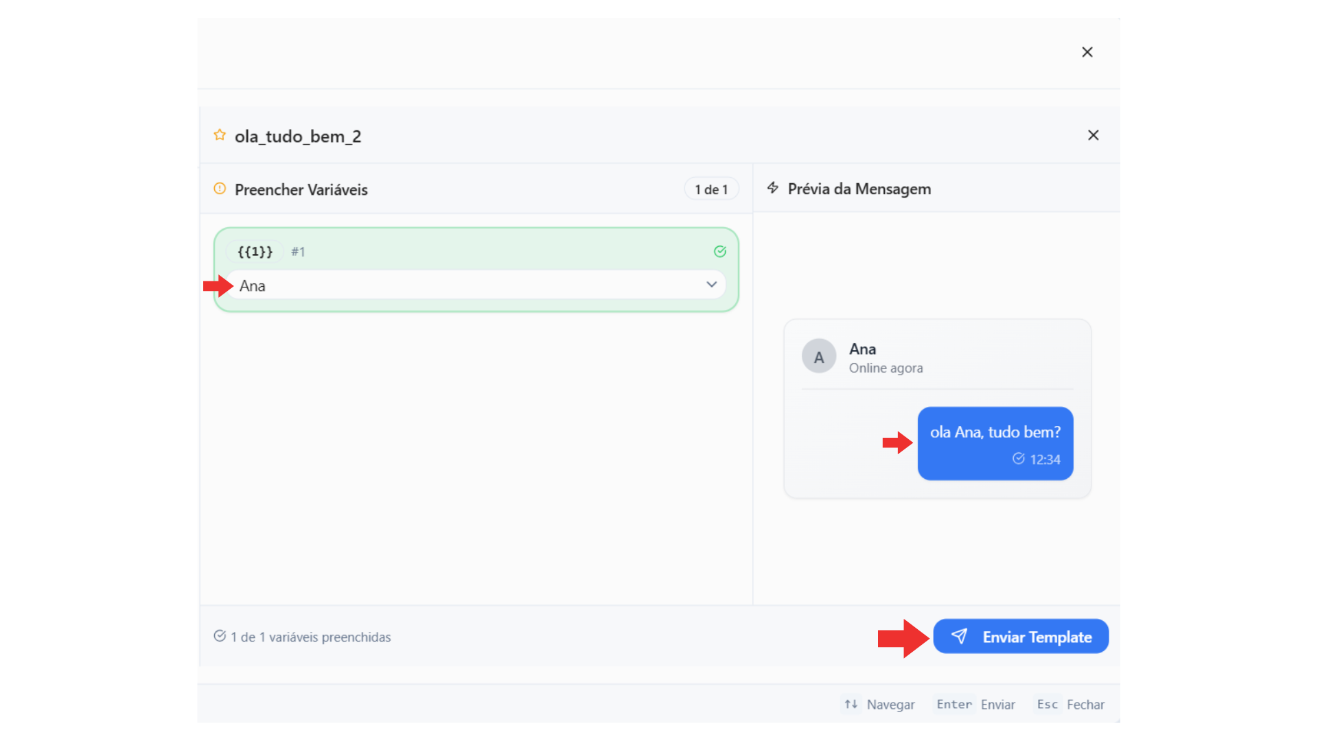 Alguns templates podem conter variáveis, representadas por chaves como {{1}}, {{2}} etc.
